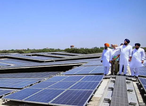 अमृतसर के पास व्यास शहर में राधा स्वामी मुख्यालय छत सौर ऊर्जा संयंत्र का एक दृश्य। इस संयत्र से में 11.5 मेगावाट बिजली का उत्पादन होता है।